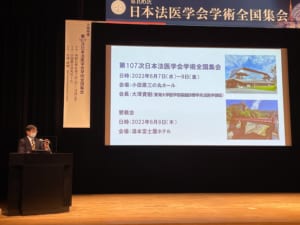また、来年行われる「第107次 日本法医学会学術全国集会」の主催大学が当校の為、教室長の大澤資樹教授が閉会式にて、来年の全国集会について告知させていただきました。日程は、2023年6月7日(水)~9日(金)、開催地は、神奈川県小田原市(予定)となっております。COVID-19の蔓延状況により、内容に変更が生じる可能性もございますが、現状では現地開催の予定となっております。多くの先生方のご参加を心よりお待ち申し上げます。詳細は決まり次第、学会メーリングリスト(legalmed)にてお知らせいたします。