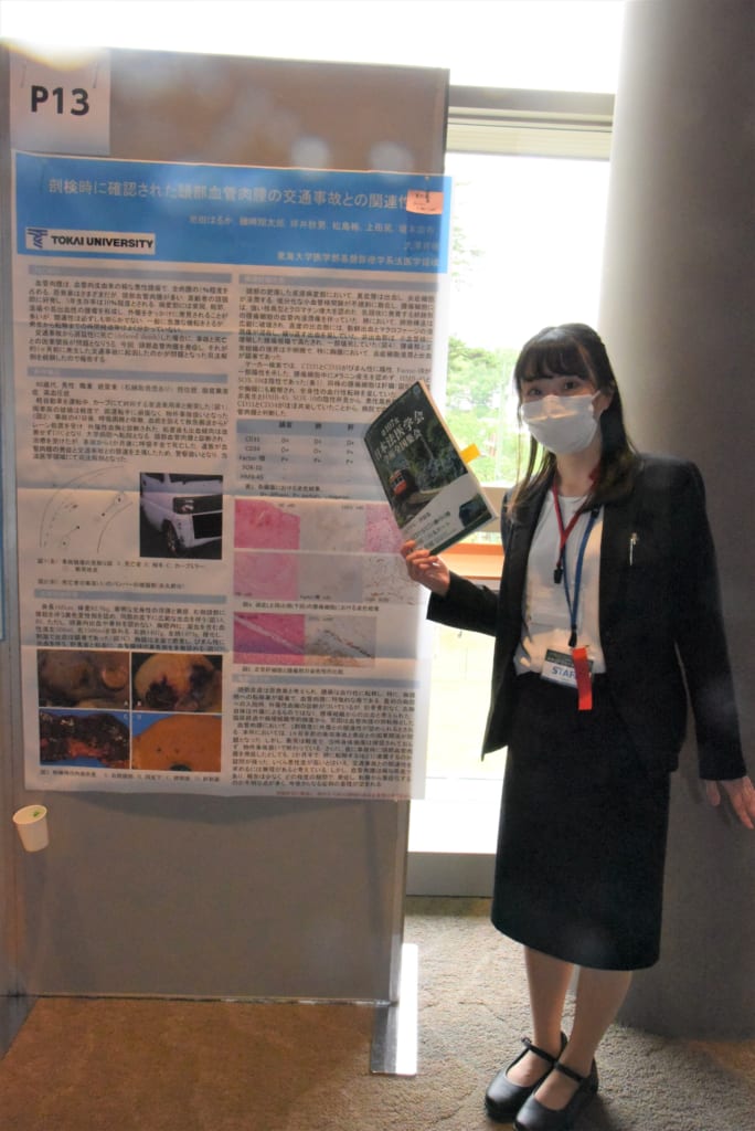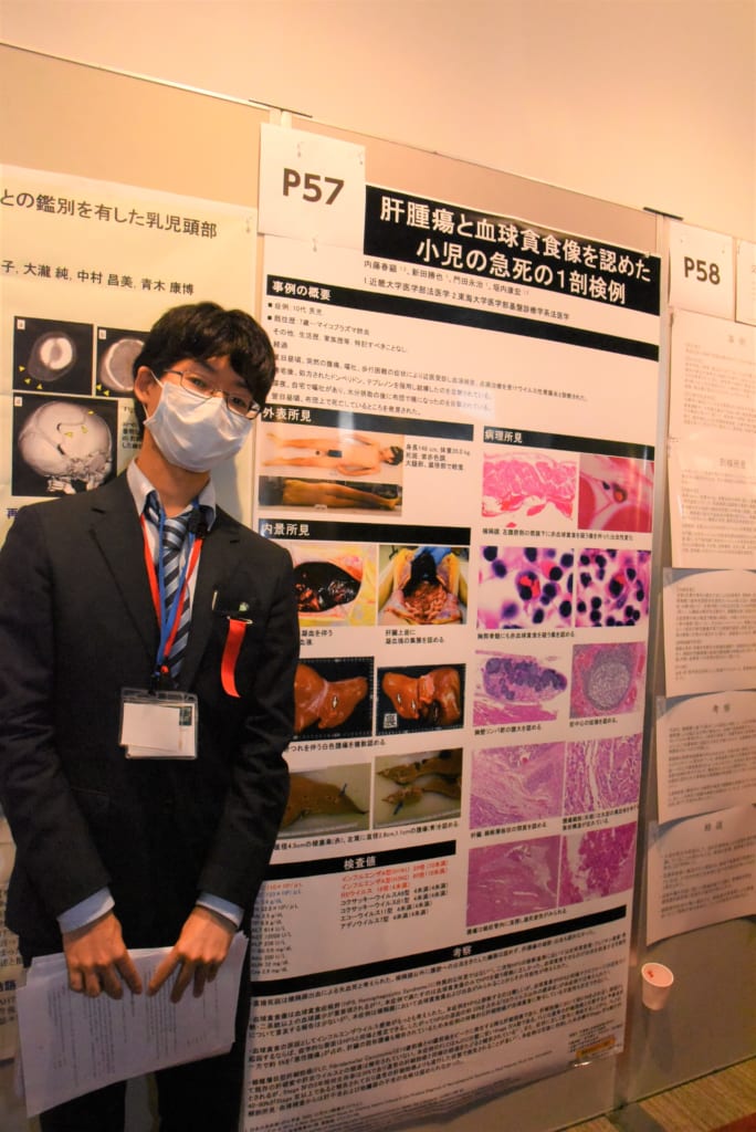 一般ポスター発表では、磯崎助教が「死亡前に高次脳機能障害が認められた脳出血の一例」、池田技術員が「剖検時に確認された頭部血管肉腫の交通事故との関連性」、大学院生の内藤が「肝腫瘤と血球貪食像を認めた小児の急死の1剖検例」と題した発表を行いました。
